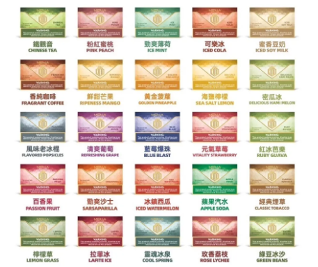 檸檬草, 拉菲冰, 靈魂冰泉, 玫香荔枝, 錄豆冰沙, 蘋果汽水, 經典煙草, 蜜香豆奶, 勁爽沙士, 勁爽薄荷, 鐵觀音, 香純咖啡, 粉紅蜜桃, 紅冰芭樂, 蜜瓜冰, 百香果, 鮮甜芒果, 黃金菠蘿, 海鹽檸檬, 元氣草莓, 冰鎮西瓜, 清爽葡萄, 風味老冰棍 |