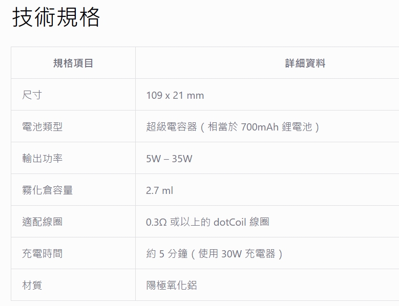 多功能輸出:支援 5W 至 35W 輸出範圍,適用於 MTL(口吸)和 DTL(直肺吸)模式,兼容 0.3Ω 及以上的 dotCoil 線圈。